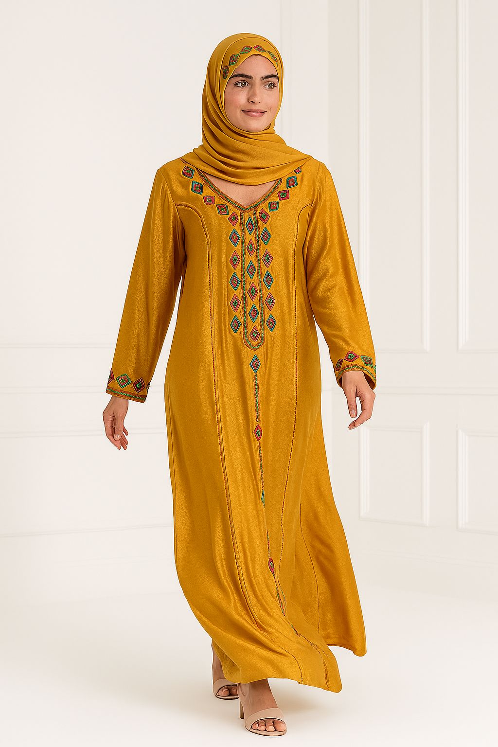 Elevate your modest fashion with this vibrant mustard yellow jalabiya, detailed with multicolored diamond-shaped embroidery on the neckline, cuffs, and front panel. A perfect piece for both casual elegance and festive gatherings.