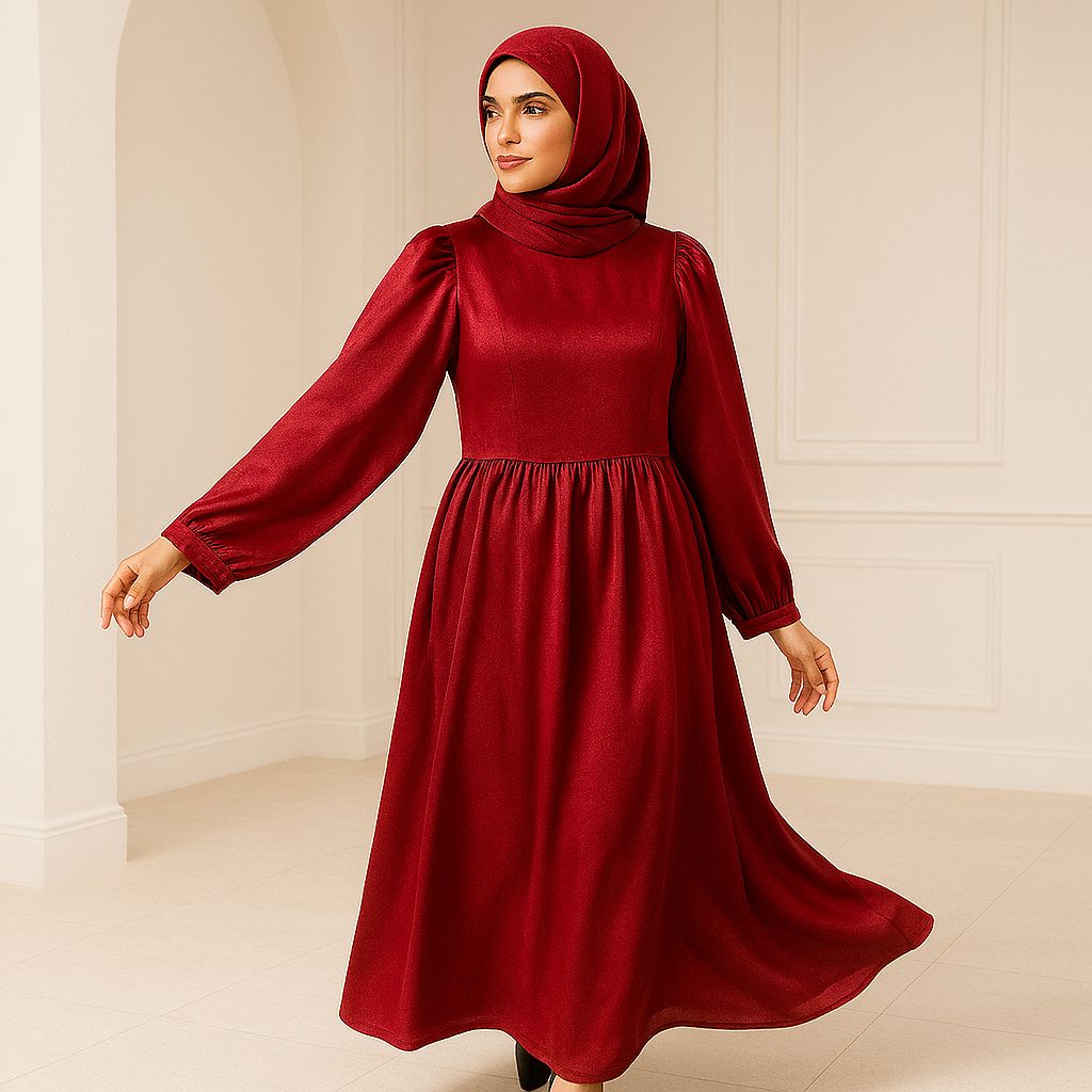 Grace meets glamour in this luxurious velvet midi dress, designed with soft pleated gathering at the waist and elegant puffed sleeves. A perfect pick for winter evenings, events, or modest formal wear!