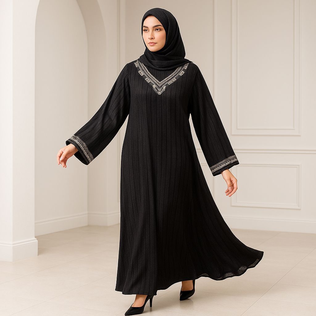 Step into timeless elegance with this sleek black jalabiya, beautifully detailed with silver V-shaped embroidery across the neckline and sleeve cuffs. Its subtle pleated texture adds dimension, making it ideal for both daily grace and evening charm.